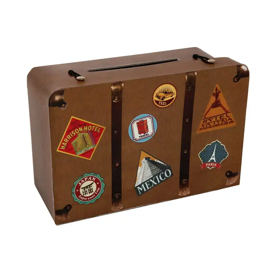 La valise est rectangulaire et fait 14 x 16 x 10 cm, elle est marron, avec de nombreuses images provenant du monde entier : Paris, Mexique, Japon etc.