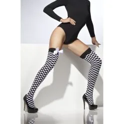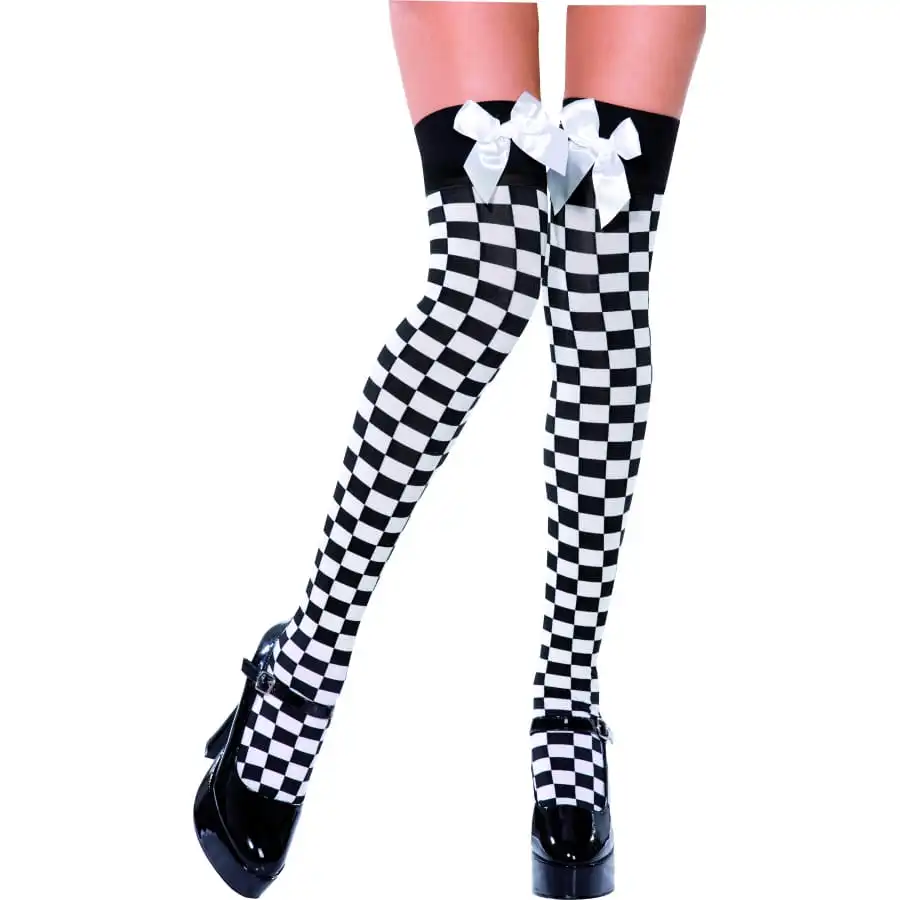 Ces bas en damier noir et blanc surmontĂ©s de grands noeuds blancs plairont aux sĂ©ductrices. C’est un accessoire sexy qui vous ira très bien pour un carnaval comme pour une soirĂ©e en amoureux.