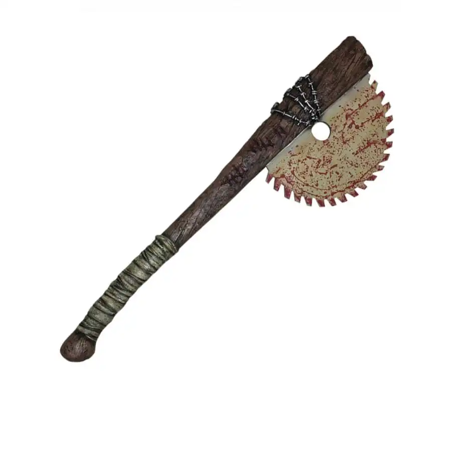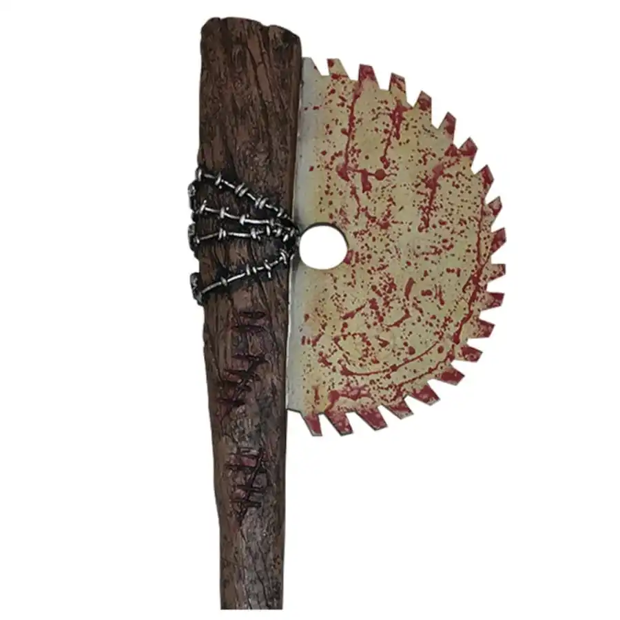Une batte de baseball surmontée d’une lame de scie circulaire tâchée de sang.
