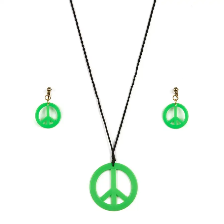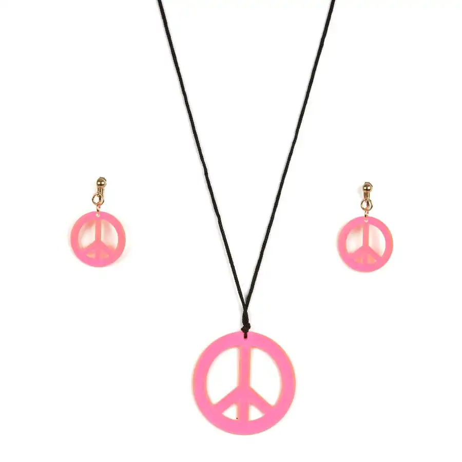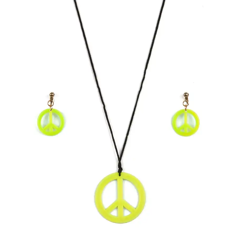 Ces bijoux aux couleurs Ă©clatantes vous plongeront dans l’univers hippie. Il s’agit d’un ensemble boucles d’oreilles et collier peace and love rose, jaune, vert ou orange. Les boucles d’oreilles sont des modèles Ă clips. Vous retrouverez le symbole peace and love Ă travers ces bijoux de couleur assortie. Bon retour dans les annĂ©es seventies !