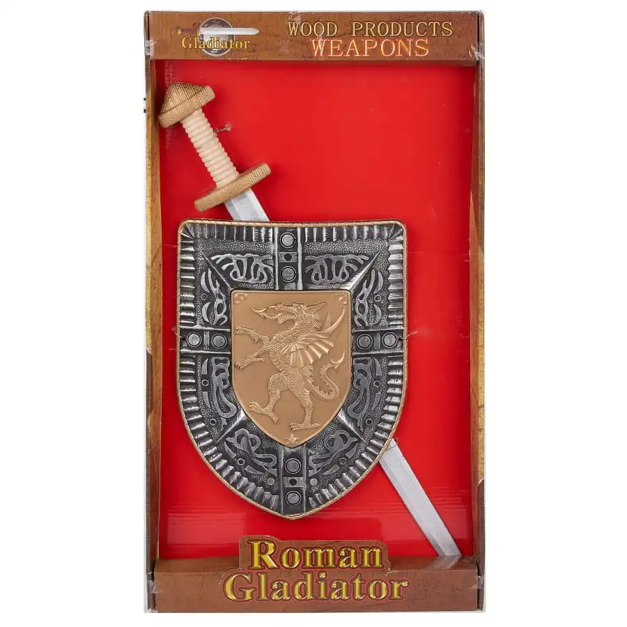 Le bouclier est quant à lui fait dans un plastique plus rigide de couleur grise avec au centre une partie dorée où est floqué un majestueux dragon.