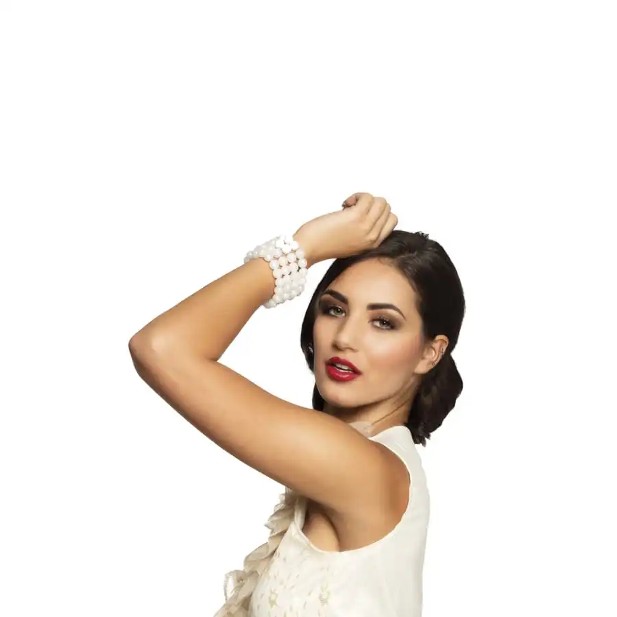 Ce bracelet 4 rangées de perles blanches est en plastique.