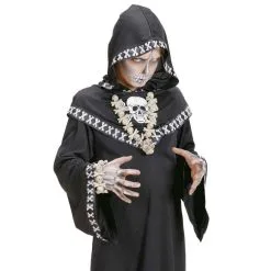 Bracelet noir composĂ© de petites tĂŞtes de mort et d’os de couleur blanche, pour homme, femme, adolescent ou adolescente. Cet accessoire convient parfaitement Ă un thème de soirĂ©e gothique ou Ă une soirĂ©e d’Halloween.