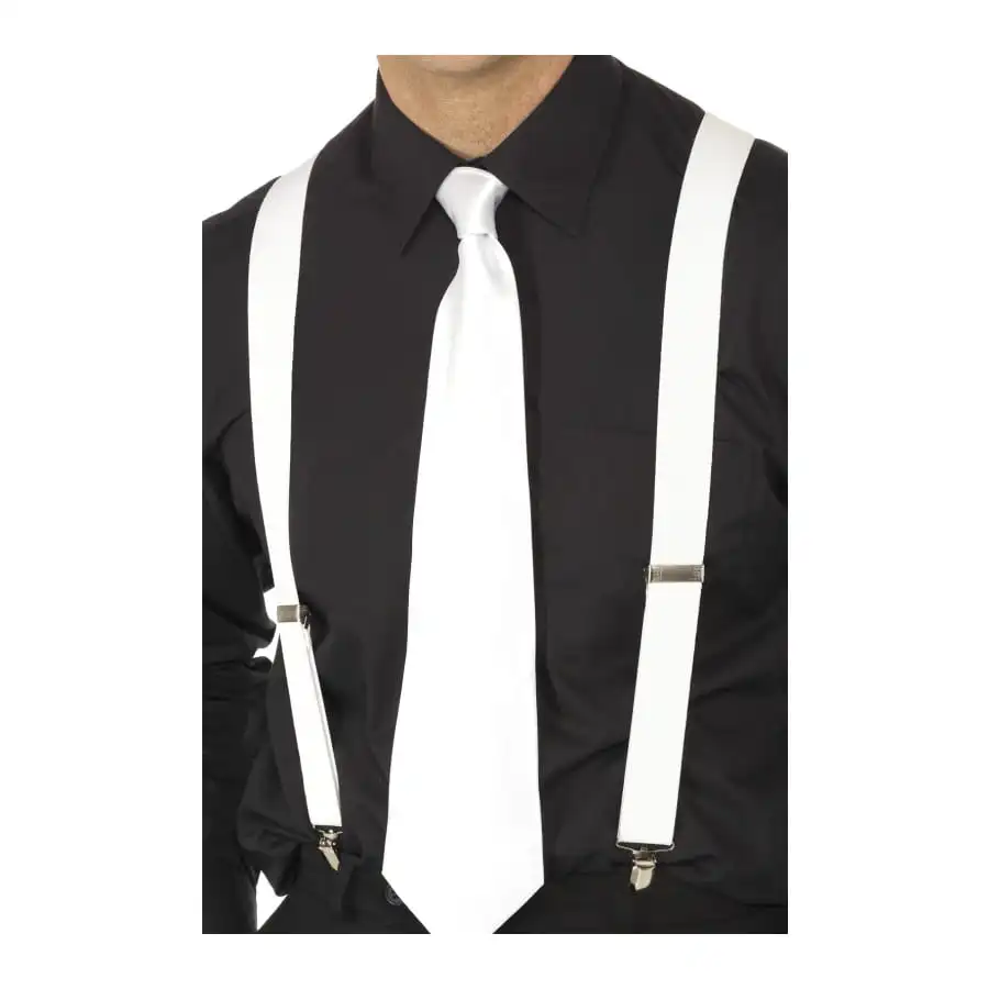 Paire de bretelles élastiques de couleur blanche, pour homme, femme, adolescent ou adolescente. Ajoutez cet accessoire pour agrémenter avec élégance un déguisement basé sur le thème de la mafia. Réagit à la lumière noire
