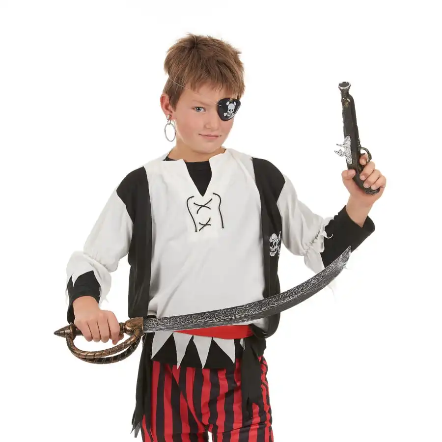 Confirmez votre appartenance Ă l’Ă©quipe des redoutables pirates des mers avec ce Cache-oeil et accessoires en plastique (Ă©pĂ©e, pistolet, boucle d’oreille) d’ancien pirate pour enfant et adulte.