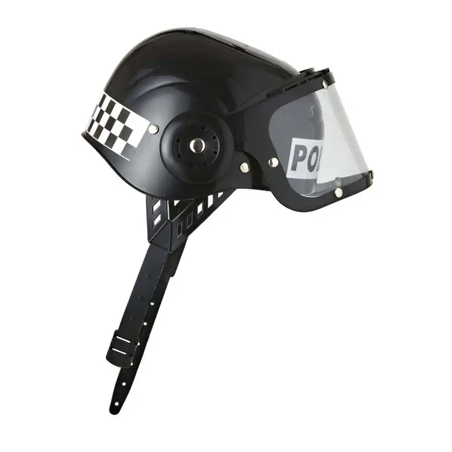 Le casque est en plastique rigide noir avec l’indication POLICE sur le devant.