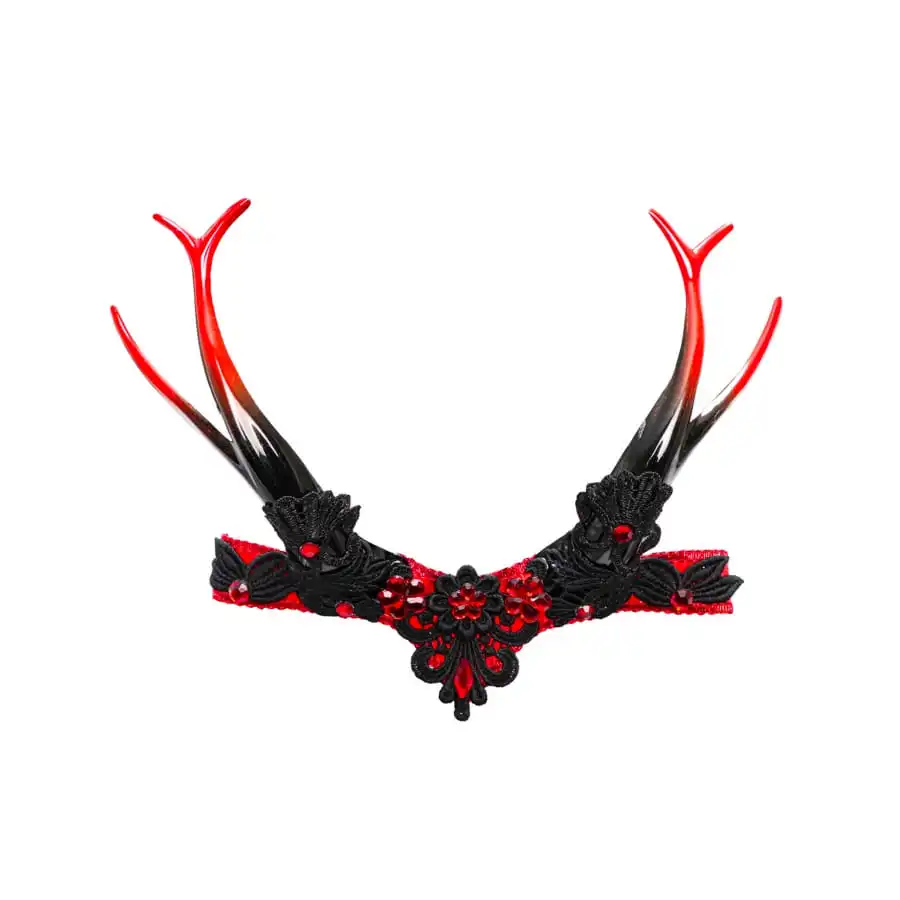 La coiffe est surmontée de faux bois de cerf très bien réalisés, avec de superbes couleurs noire et rouge unies par un dégradé.