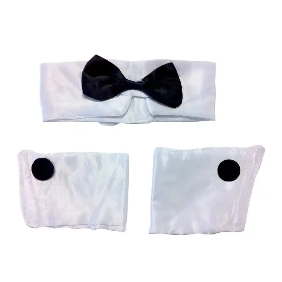 Il est fourni avec deux manchettes blanches en tissu effet satinĂ©, avec un faux bouton en tissu noir sur chacune d’elles.