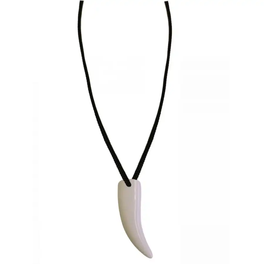 Le collier de Brice de Nice est constituĂ© d’une fine corde noire et d’une fausse dent blanche de requin en guise de pendentif.