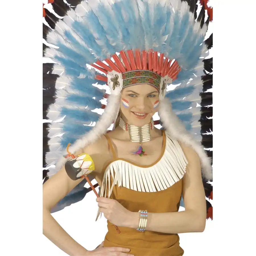 Les indiennes ont tout pour plaire : une garde-robe originale, une magnifique chevelure, et aussi de superbes bijoux. Saisissez une occasion en or en vous procurant ce collier indien pour femme. L’accessoire est en plastique avec de fausses plumes placĂ©es au centre. Il prĂ©sente un aspect imitation nacre accompagnĂ© de multiples couleurs. Ce collier sera idĂ©al pour complĂ©ter un dĂ©guisement d’indienne.