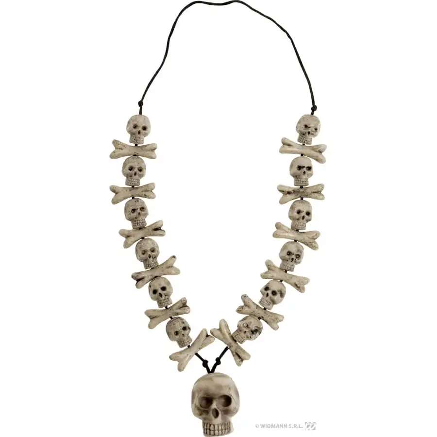Pour finaliser votre déguisement de sorcier ou de sorcière, ce collier vous servira. Vos amis seront étonnés par ce collier. Vous pourrez aussi le porter à plusieurs occasions comme Halloween ou une soirée gothique. De couleur noir le collier a des têtes de mort beige dessus tout le long pour finir a la fin une plus grosse tête de mort.