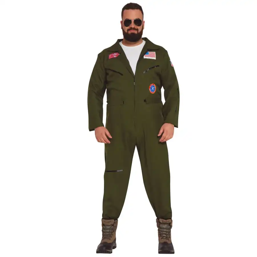 Cette combinaison ultra rĂ©aliste prĂ©sente un vert kaki qui s’inscrit parfaitement dans le style uniforme d’aviateur.