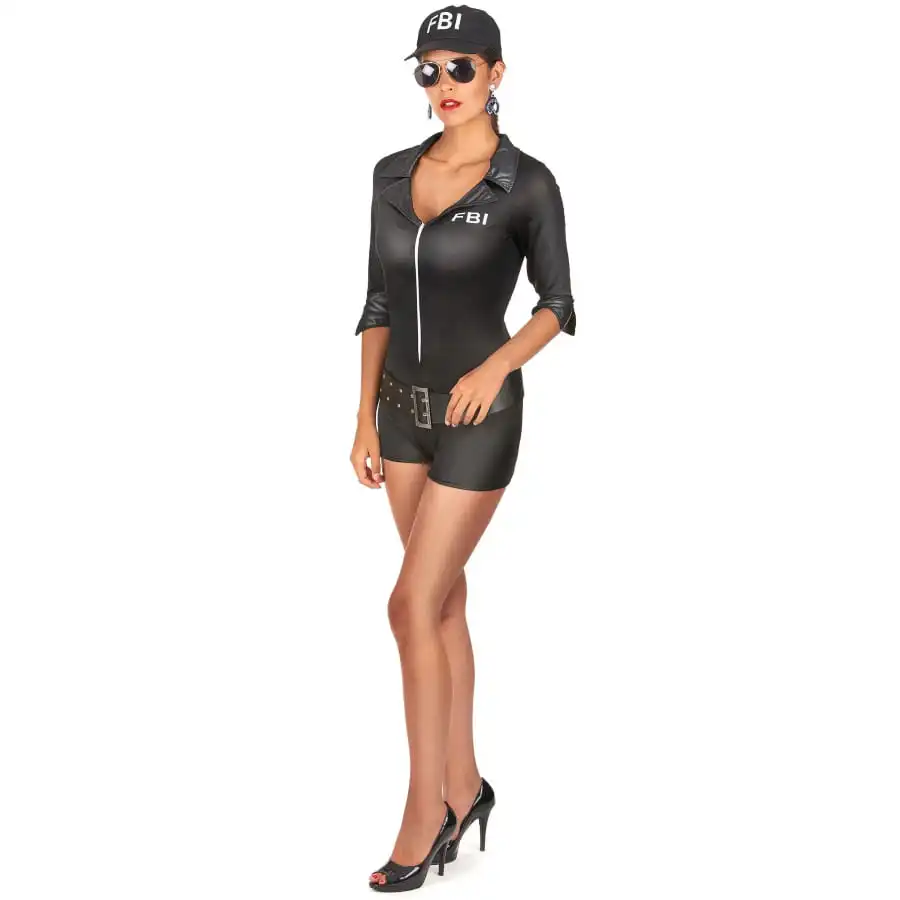 Mesdames, mesdemoiselles, nous avons enfin trouvĂ© la tenue parfaite pour donner un peu de piment Ă vos soirĂ©es dĂ©guisĂ©es. Cette combinaison FBI sexy, extensible, pour femme est ce qu’il vous faut. Il s’agit d’une combinaison mini- short en tissu extensible, de couleur noire, dĂ©colletĂ©e Ă manches trois quart. Elle est moulante mais facile Ă enfiler grâce Ă la fermeture Ă©clair du devant. Sur la poitrine gauche, on retrouve l’inscription FBI en blanc, de mĂŞme que sur la casquette noire assortie. Enfin, une ceinture noire Ă boucle vient se poser un peu au-dessous de la taille. Cette tenue de charme sera très seyante pour une soirĂ©e entre amoureux Ă la Saint-Valentin.