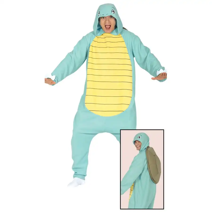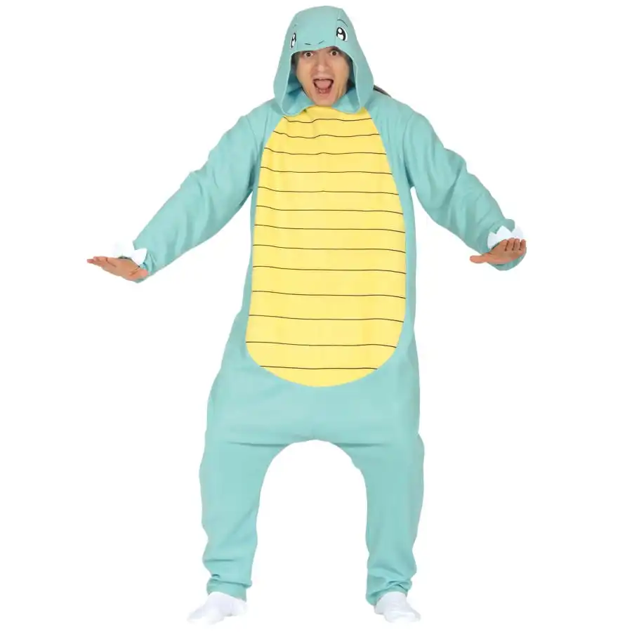 La combinaison petite tortue style Frankelin adulte est de couleur bleue, Ă l’exception du ventre qui est de couleur jaune avec des rayures.