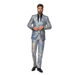 Faites parler le bling bling pour votre prochaine soirée sur le thème des années 80, avec le costume 3 pièces argenté holographique.