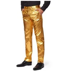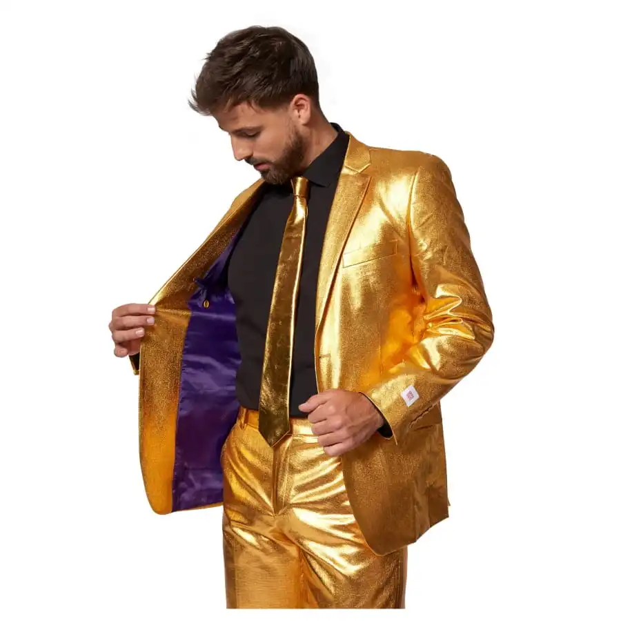 Il s’agit ici d’un costume qui vous assure de briller de mille feux. L’ensemble se compose de 3 pièces : une veste, une cravate et un pantalon. Tous les éléments de l’ensemble sont de couleur gold uni.