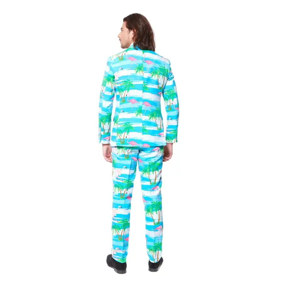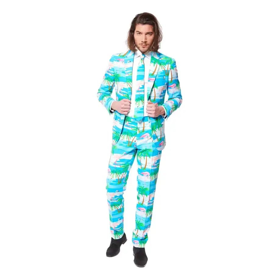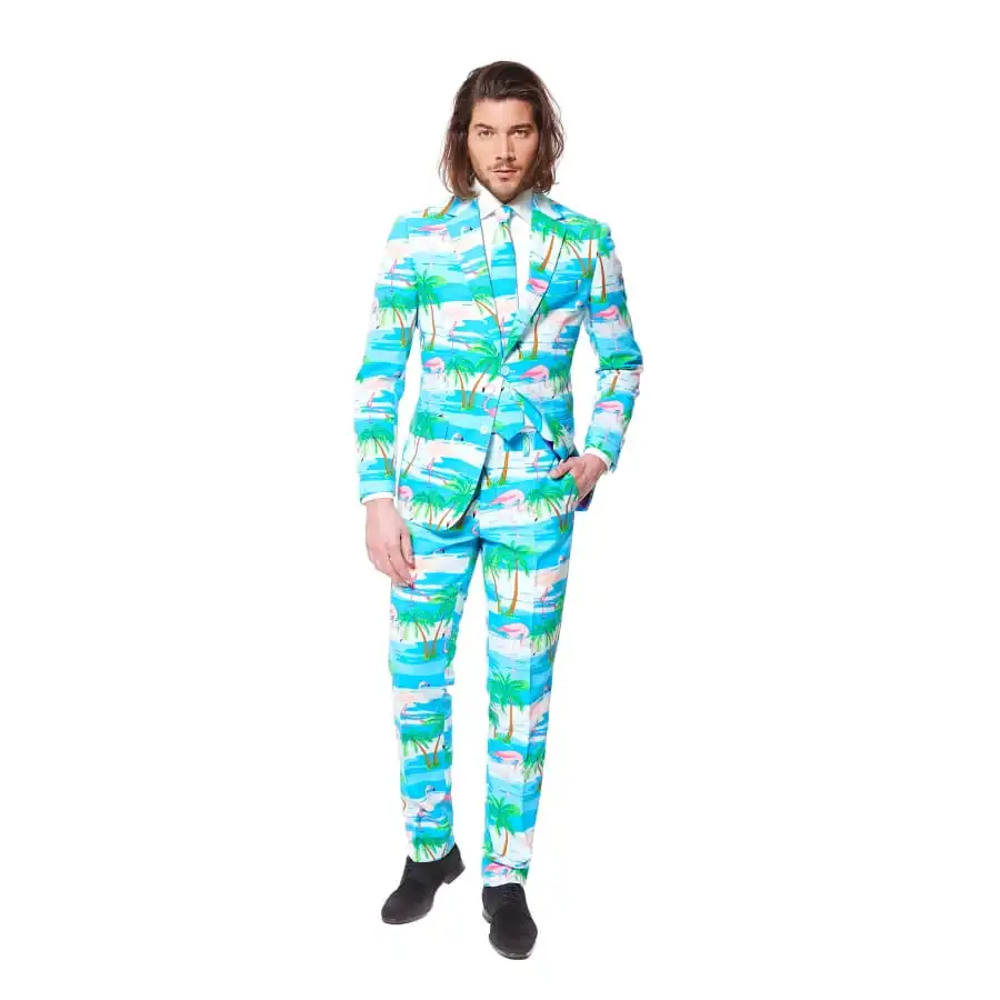 Il contient une cravate, une veste et un pantalon, tous avec des imprimés colorés de flamants rose, de palmiers et de mer.