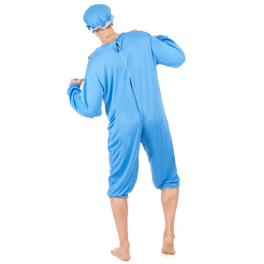 Un drôle de bébé s’affiche à une soirée d’enterrement de vie de célibataire ! Qui ne se tordrait pas de rire en vous voyant dans ce costume bleu de grand bébé pour adulte. Tout comme un nouveau-né, vous porterez une combinaison et un bonnet assortis. La combinaison en question est de couleur bleue, avec une fausse poche et un bavoir de couleur orange et jaune. Les manches sont longues et resserrées aux extrémités, tandis que le bas de la combinaison descend en dessous du genou. Quant au bonnet, il est de la même couleur que la combinaison avec une bordure en fine dentelle blanche. Grâce à son élastique, l’accessoire s’adapte à tous les tours de tête.