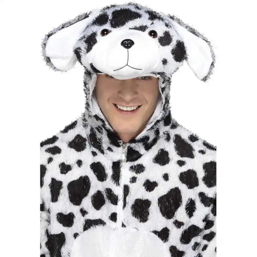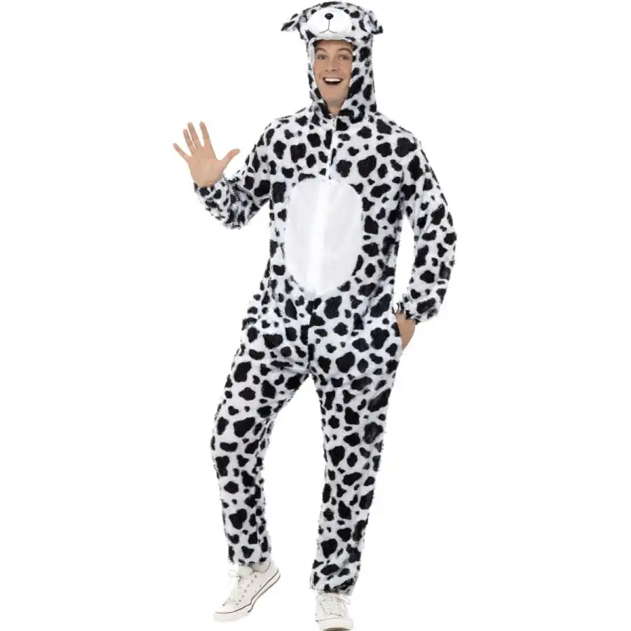 Sous licence Disney, pour homme ou mascotte, une combinaison en peluche noir et blanc avec cagoule assortie intégrée. Cet ensemble est disponible en taille M. Il est idéal pour se transformer en dalmatien.