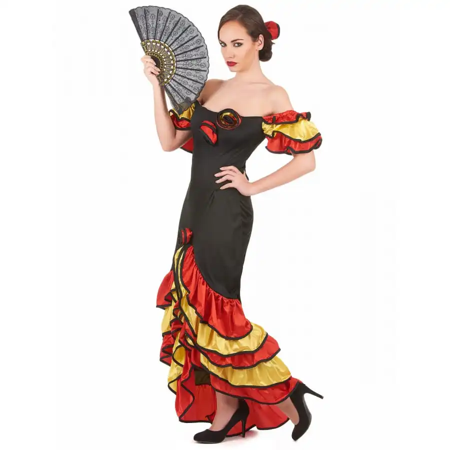Les danseuses de flamenco sont considĂ©rĂ©es comme des femmes sveltes et gracieuses, nous vous proposons d’en incarner une pour vos fĂŞtes dĂ©guisĂ©es avec ce costume danseuse de flamenco rouge noir or. Il s’agit d’une robe noire Ă volants rouges et dorĂ©s. Le haut est dĂ©nudĂ© au niveau des Ă©paules, avec des volants sur les bras et deux fleurs sur la poitrine. Le bas, quant Ă lui, est muni d’une grande fente sur le devant, avec des volants de couleur rouge et or formant une traĂ®ne. Pour agrĂ©menter votre coiffure, le costume comprend une grosse fleur assortie Ă la tenue. Ce dĂ©guisement va en charmer plus d’un Ă votre soirĂ©e.