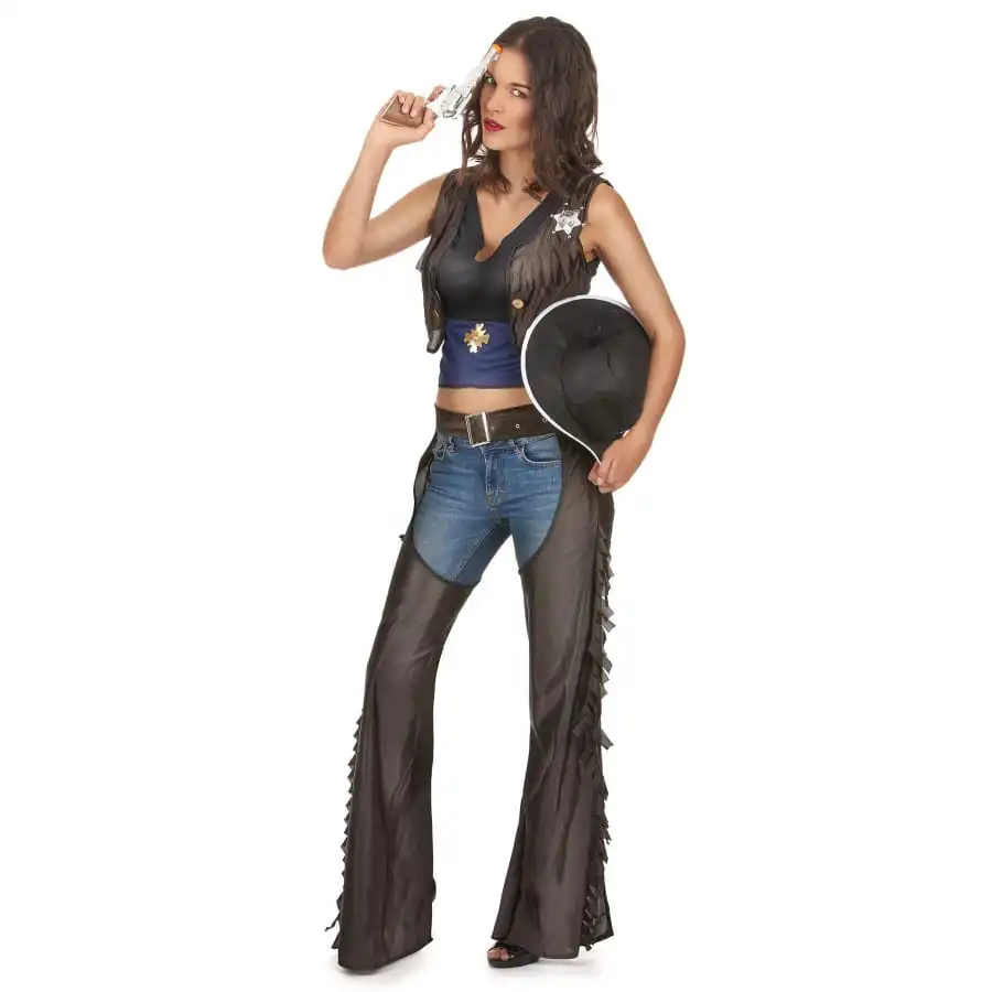 Ce costume de cow girl avec chaps composĂ© d’un haut, d’un sur-pantalon et d’un chapeau est le dĂ©guisement idĂ©al pour les fĂŞtes Ă thème Western.
