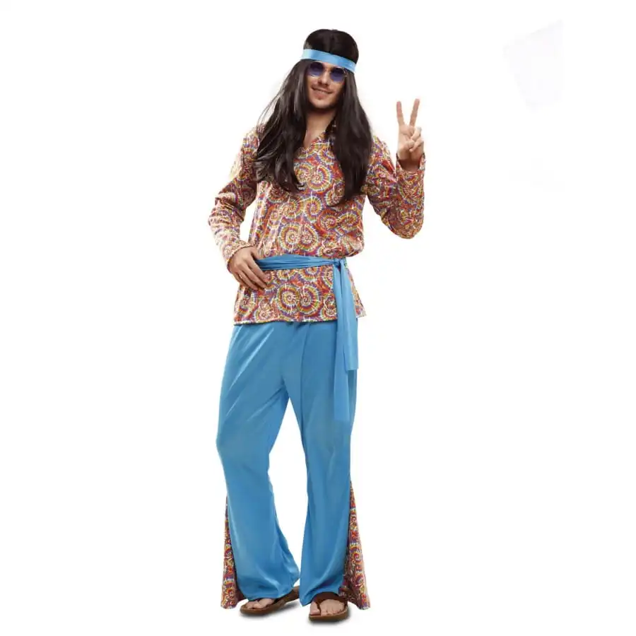 C’est parti pour une visite guidĂ©e des annĂ©es rĂ©tro, grâce au costume de hippie bleu pour homme.