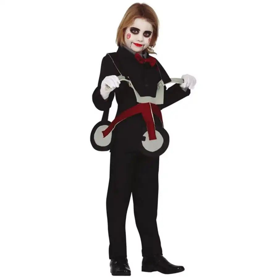Avec le costume de pantin tueur sur tricycle, pour enfant, votre petit monstre placera la barre très haut pour la nuit d’Halloween.