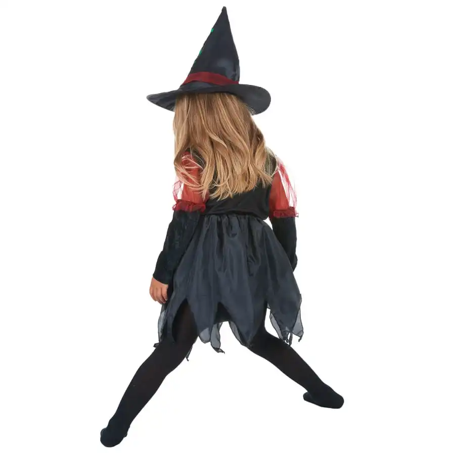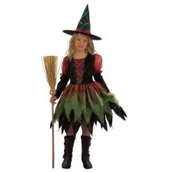 Votre fille sera une coquette sorcière le temps d’halloween si elle enfile le costume de petite sorcière verte avec tulle. Cet article reste disponible sur notre site. Il contient une petite robe verte et rouge. Le haut de la robe possède des manches longues et il se compose de tissu à l’aspect de velours. Au niveau du buste, un faux corsage orne la robe pour un effet très classe. La partie jupe de la robe est faite d’une superposition de voile et du même tissu noir à l’aspect velours. Les couleurs rouge, noir et verte se retrouvent sur cette jupe. Un chapeau de sorcière complète ce déguisement. De couleur noire, un ruban vert et un voile rouge le décorent.