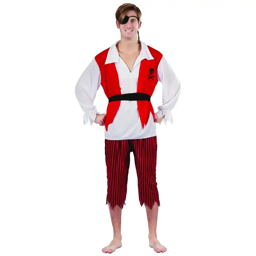 Le costume de pirate rouge blanc et noir pour adulte est un déguisement fait pour les hommes.