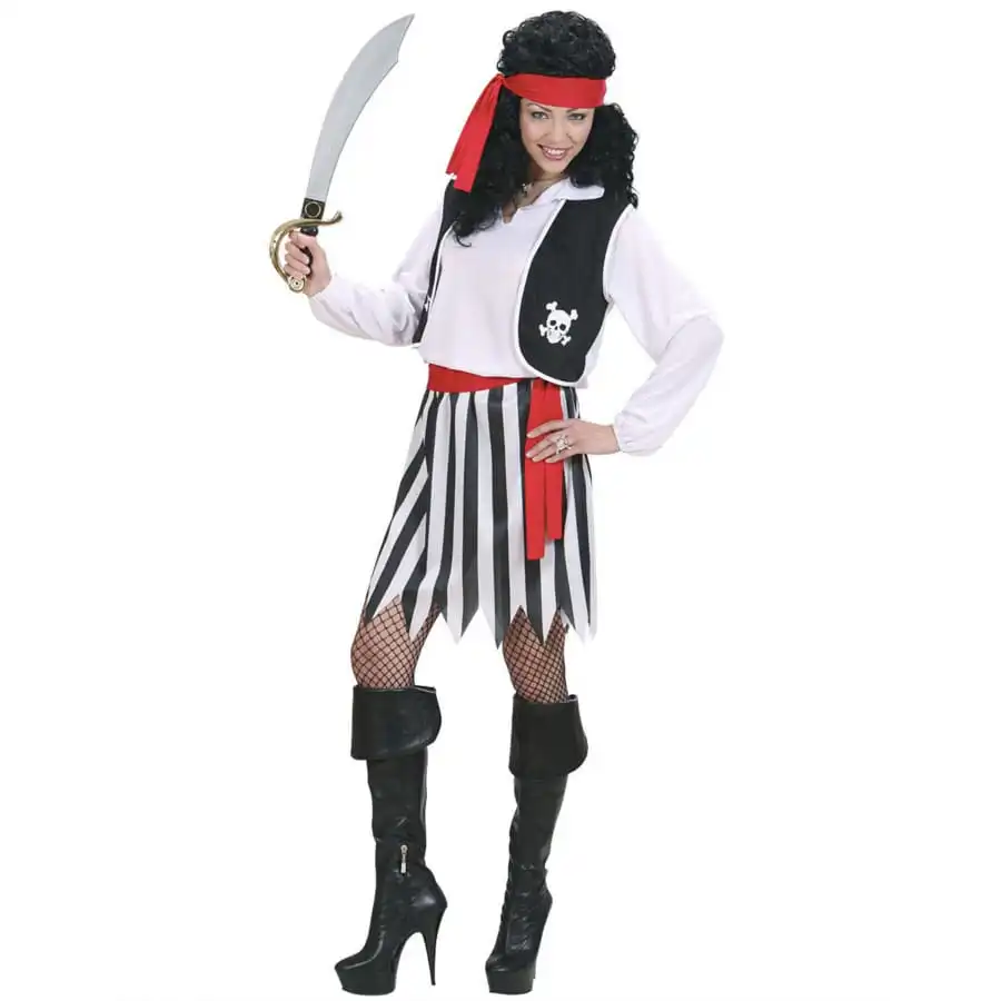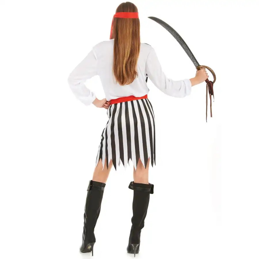 Pourquoi ne pas opter pour un costume de piratesse robe rayĂ©e noire et blanche pour la fĂŞte des morts ? Un tel dĂ©guisement fait partie des incontournables d’halloween ! Il contient une jupe Ă rayures verticales noires et blanches maintenue par une ceinture rouge. Les bordures de la jupe prĂ©sentent des dĂ©coupes en dents de scie pour un effet dĂ©chiquetĂ©. Le haut est un chemisier blanc Ă manches longues et bouffantes. Conçu dans une matière souple et lĂ©gère, il offre un confort au port. Un gilet noir avec une tĂŞte de mort de chaque cĂ´tĂ© se met sur ce chemisier. Pour complĂ©ter l’ensemble, un bandeau rouge se noue Ă la tĂŞte pour un vrai look de pirate !