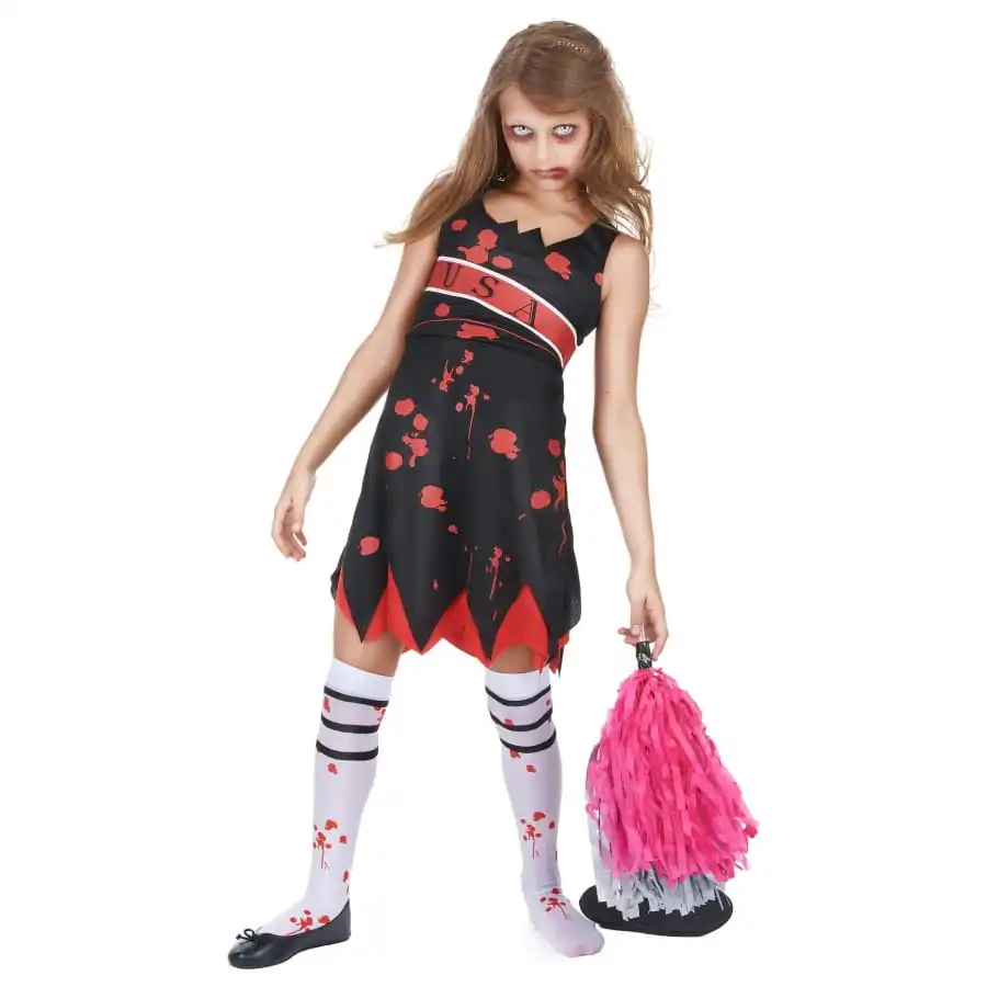 Le costume de pompom girl zombie pour enfant est un assortiment constituĂ© d’une robe et d’une paire de chaussettes.