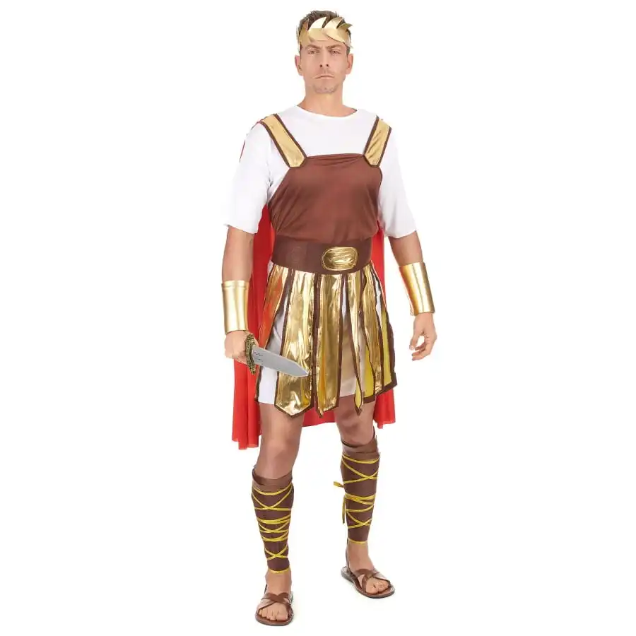 Pour ĂŞtre admis dans l’armĂ©e romaine, il vous faudra votre costume de soldat romain avec cape rouge. Ce dĂ©guisement comprend sept Ă©lĂ©ments indissociables. Il s’agit tout d’abord d’une tunique de couleur blanche Ă manches courtes accompagnĂ©e d’une cape rouge et de bretelles dorĂ©es. Vous disposerez aussi d’un faux plastron de couleur marron qui a Ă©tĂ© cousu Ă l’avant. Vous porterez Ă©galement une jupe de centurion romain de couleur marron et or qu’il vous suffira de nouer dans le dos. CĂ´tĂ© accessoires, vous aurez droit Ă deux bracelets en mousse souple, de couleur dorĂ©e, qui se fixent Ă l’aide de scratches, ainsi que deux jambières en feutrine de couleur marron, Ă fixer Ă l’aide de deux rubans dorĂ©s Ă entrelacer. Pour couronner le tout, une couronne dorĂ©e Ă©lastique sera posĂ©e sur votre tĂŞte. Sa forme Ă©voque celle des lauriers.