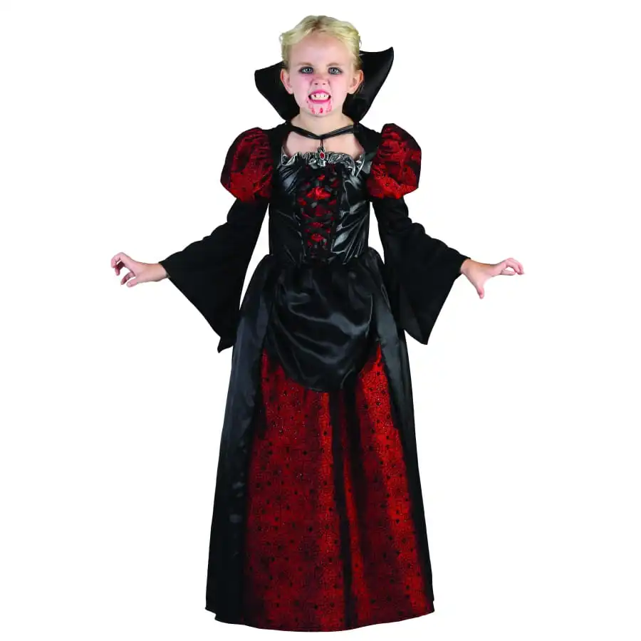 La vie de vampire ne se rĂ©sume pas Ă aller chercher du sang pour se nourrir. Eux aussi, ils font la fĂŞte pour s’amuser tout comme vous ! Justement, Halloween est une des pĂ©riodes qu’ils prĂ©fèrent car ils peuvent sortir incognito. Les petites filles raffolent des histoires de vampires, alors il est peut-ĂŞtre temps de leur faire un petit cadeau. Optez pour ce ravissant costume de vampiresse. Il est constituĂ© d’une magnifique robe, toute longue, de couleur rouge et noire. La dĂ©coupe a Ă©tĂ© soigneusement mise au point pour que votre fillette puisse incarner Ă la perfection la fille de Dracula. Ce modèle est proposĂ© en deux diffĂ©rentes tailles : pour les 7 Ă 9 ans et pour les 10 Ă 12 ans.