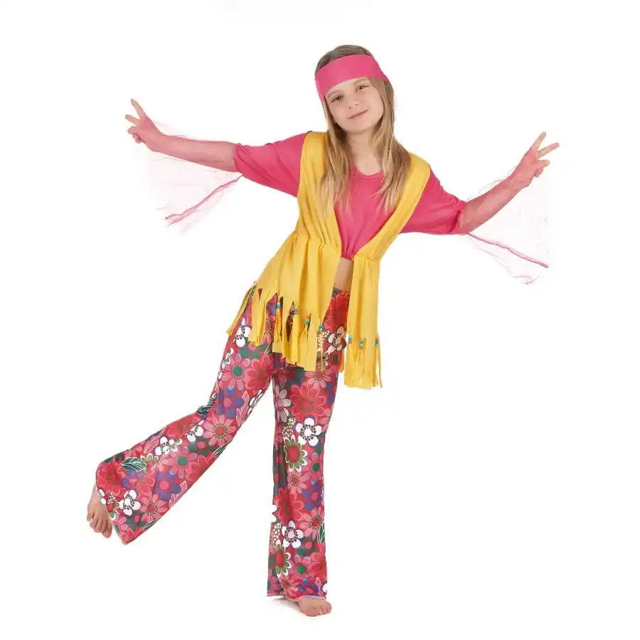 Rien de tel qu’une fĂŞte pleine de couleurs pour bien s’amuser. C’est dans cet esprit que nous vous proposons ce costume hippie fleuri rose et jaune pour fillette, pour une fĂŞte Ă thème hippie ou tout autre Ă©vènement costumĂ©. Il s’agit d’un ensemble composĂ© d’un pantalon fleuri, d’un haut rose Ă manche Ă©vasĂ©es, avec par-dessus un gilet de couleur jaune avec des franges, qui vient ajouter du style au dĂ©guisement. Pour finir, un bandeau de couleur assorti au haut du dĂ©guisement pourra orner les cheveux. Vous pourrez Ă©galement retrouver des accessoires pour cette tenue dans la section adĂ©quate de notre site, comme par exemple une paire de lunettes colorĂ©es ou encore des colliers en tout genre.