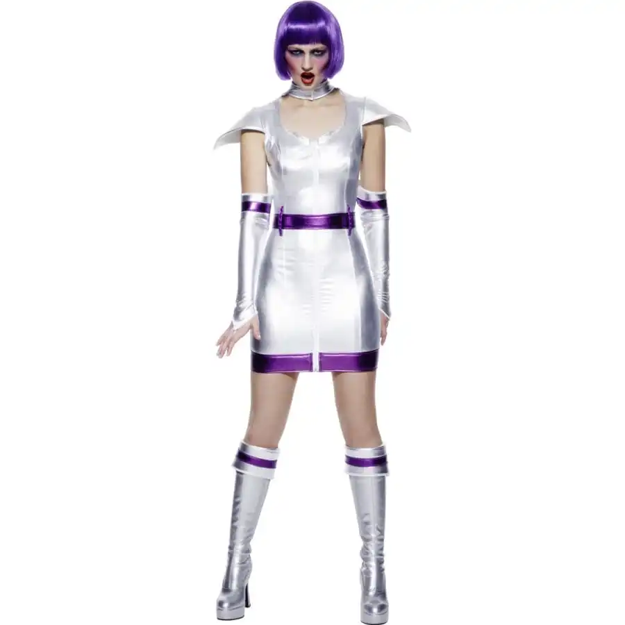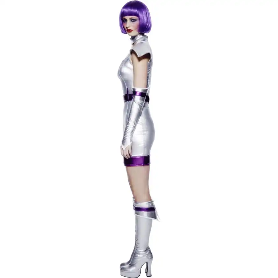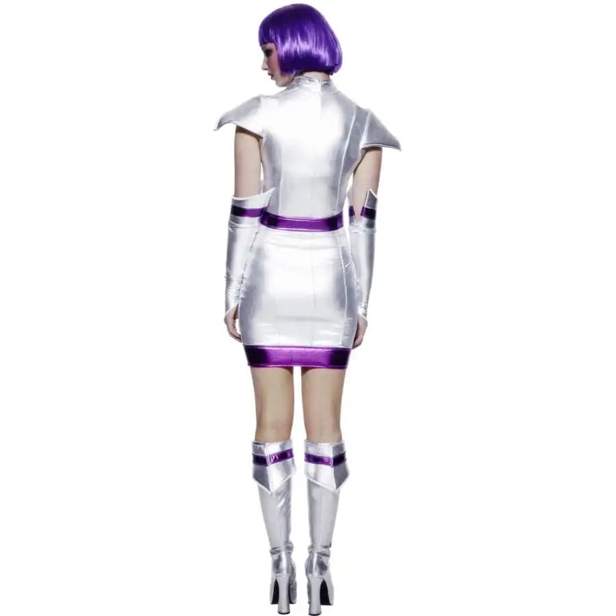 Vous pourrez sans problème vous rendre Ă une fĂŞte intergalactique avec cette robe très courte de couleur argentĂ©e avec bordure pourpre, la ceinture et une paire de gants et de surbottes. Cet ensemble est disponible en taille M, S ou L. C’est le dĂ©guisement parfait pour devenir une vraie reine de l’espace.
