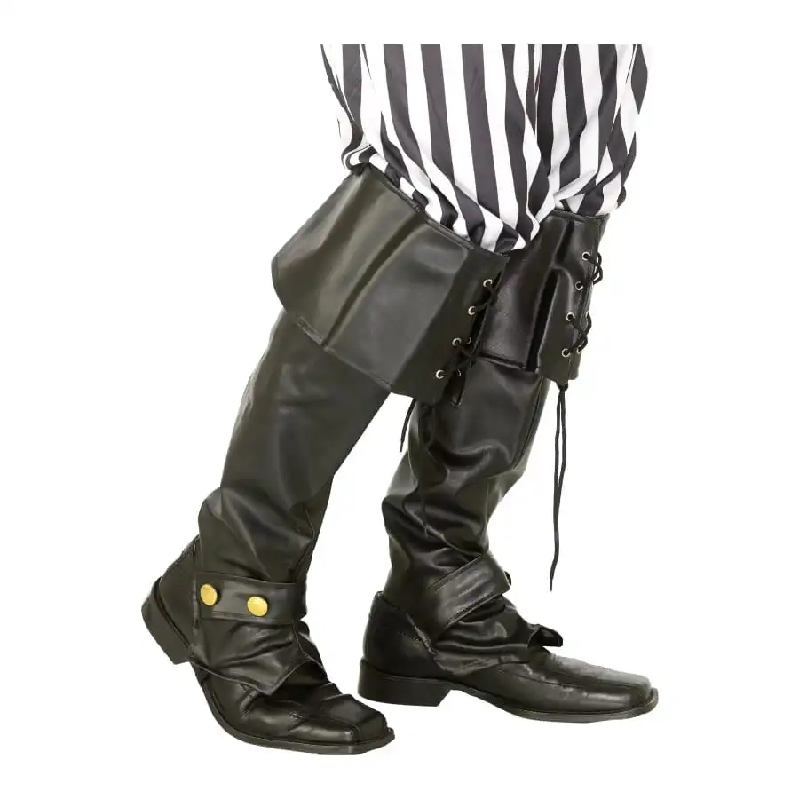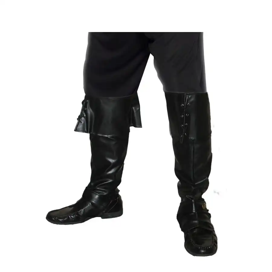 Paire de couvre-bottes de pirate de couleur noire pour homme. Cet accessoire de luxe est en matière similaire à du cuir et est spécialement conçu pour compléter un déguisement de pirate.