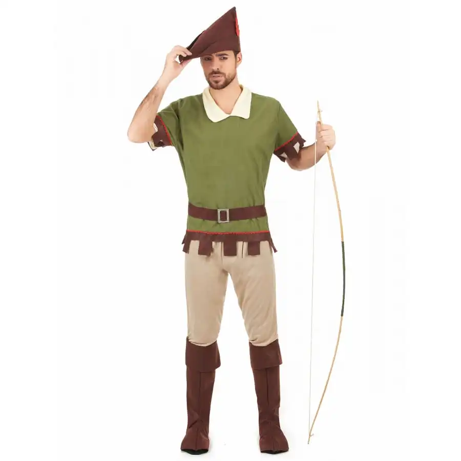 L’ensemble s’accompagne d’un couvre-chef mĂ©diĂ©val en feutre marron dĂ©corĂ© d’une plume rouge dans le mĂŞme tissu.