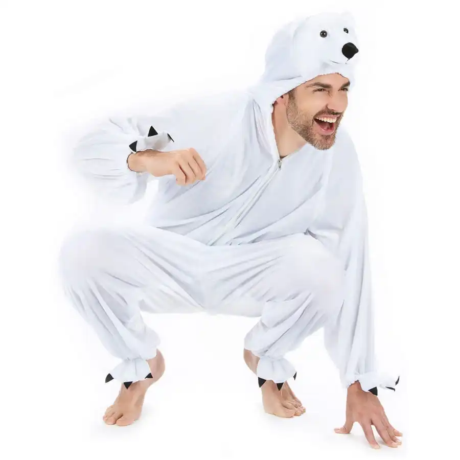 Procurez-vous ce déguisement d’ours polaire avec capuche tête pour le carnaval.