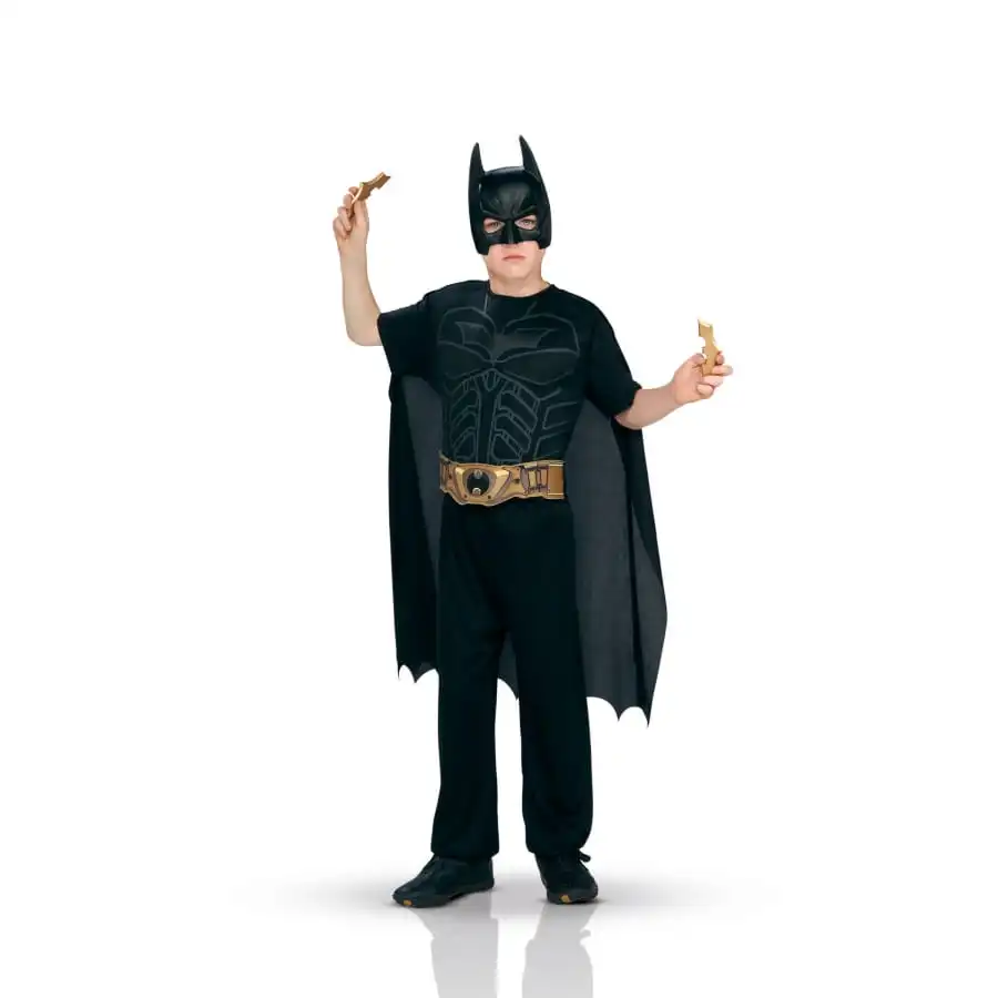 Un demi-masque en plastique rigide recouvrira la moitié du visage de votre enfant et les deux batarangs dorés accessoiriseront à merveille ce déguisement de super héros.