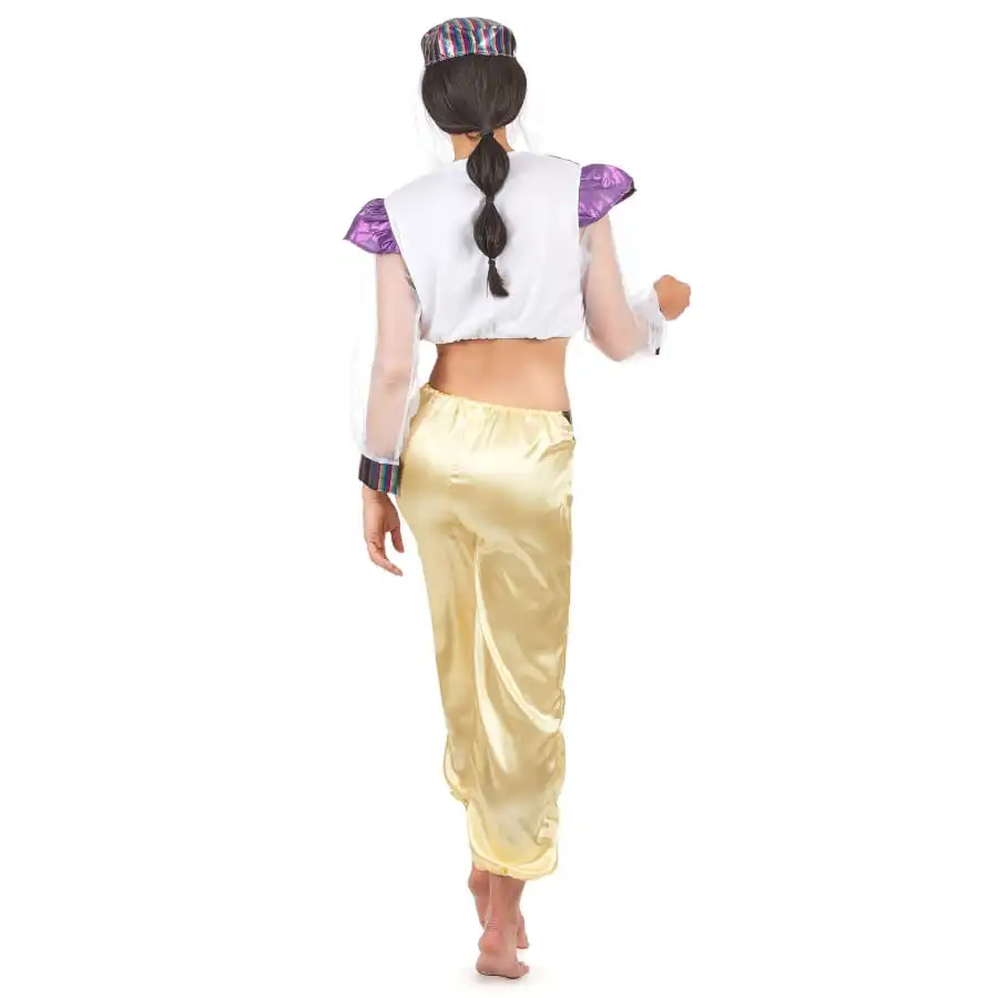 Les danseuses orientales attirent les regards dans leurs tenues qui font rĂŞver. Lancez-vous dans la danse du ventre en commandant ce magnifique dĂ©guisement de danseuse orientale violet et blanc. Vous porterez un petit haut blanc qui laisse le ventre Ă l’air. Un faux gilet Ă manches courtes a Ă©tĂ© cousu par devant. Il est de couleur violet agrĂ©mentĂ© de liserĂ©s dorĂ©s. Les manches du haut sont en voile blanc transparent, avec des extrĂ©mitĂ©s Ă rayures multicolores. Le pantalon qui va avec la tenue est de couleur or et bronze, ornĂ© de quelques rayures colorĂ©es sur le devant. La coiffe prĂ©sente Ă©galement diffĂ©rentes bandes de couleurs en rayures verticales, agrĂ©mentĂ©es d’un lĂ©ger voile blanc transparent.