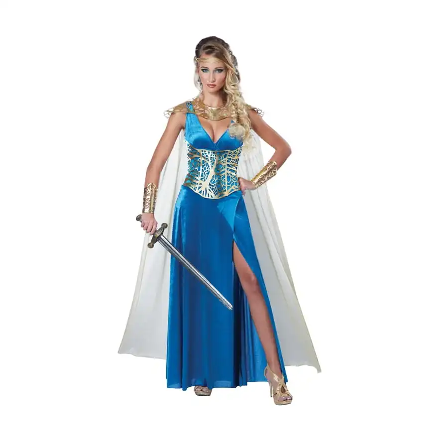 Une Reine insaisissable et charismatique, voilà ce que vous serez en étant vêtue de ce costume majestueux que nous vous proposons ici. En satin bleu turquoise, ornée par des accessoires dorés très radiants, cette tenue en impressionnera plus d’un. Elle se compose d’une longue robe uni-jambière, décolletée et sans manches. Les magnifiques touches dorées assorties viennent embellir l’ensemble : un corset, une paire de manchettes et une armure d’épaule. Et pour la touche finale, une longue cape royale blanche est aussi comprise dans ce costume. Il est dédié à la gente féminine, dont les tailles sont : L/ M/ S/ XS. Portez-le lors d’une soirée à thème « Guerre » ou des bals costumés, et n’oubliez pas de vous équiper d’une épée royale, pour un total look de Reine guerrière.