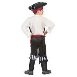 Si votre petit bambin rêve d’une tenue de pirate pour la fête d’halloween, nous avons un article taillé pour lui. Il s’agit du déguisement de petit pirate motif tête de mort, disponible sur notre site. Il est constitué d’un pantalon noir maintenu par un élastique. Des sur-bottes en matière effet feutrine se trouvent rattachées à celui-ci. Elles ont un revers à rayures noires et blancs, cousu avec le pantalon. Un tablier noir présentant une tête de mort et des sabres vient recouvrir cet ensemble et se noue à la taille. Le haut de la tenue est une chemise blanche avec un gilet noir rattaché. L’ensemble est accompagné d’un chapeau noir de pirate avec un ruban rouge le bordant.