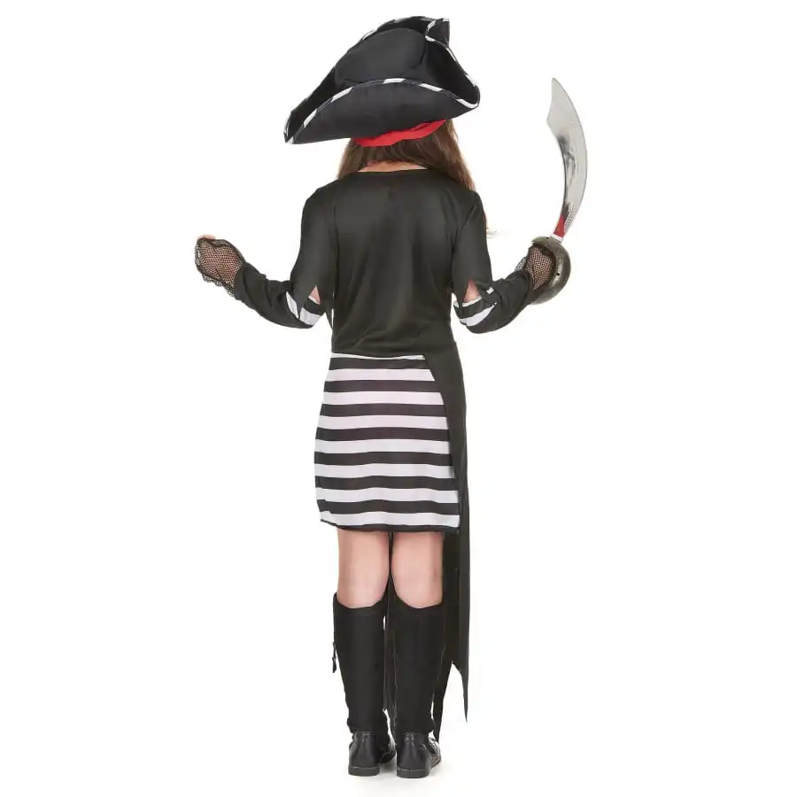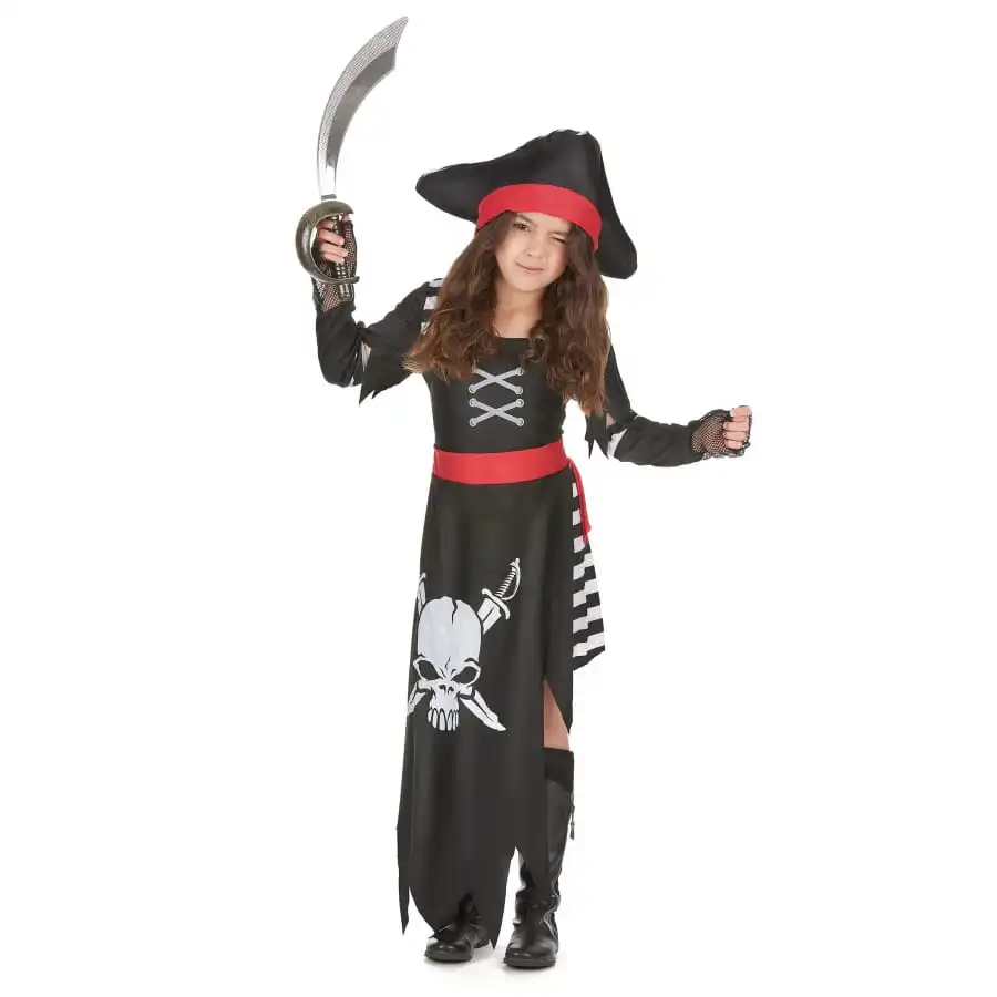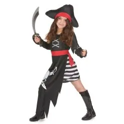 Déguisez votre petite fille en pirate le temps de la fête des morts. Pour ce faire, le déguisement de pirate tête de mort pour fillette reste l’article qu’il vous faut. Il est constitué d’une robe à deux parties. En effet le bas est une minijupe à rayures horizontales noires et blanches. Quant au haut, il est de couleur noire avec un faux corsage blanc comme décoration. Ses manches courtes se prolongent par des tours de poignet en dentelles noires. Un tablier avec un imprimé tête de mort et sabres recouvre la jupe, avec une fausse ceinture rouge à la taille. Un chapeau de pirate noir à ruban rouge complète le tout.