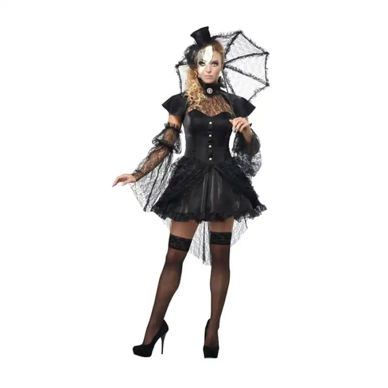 Voici un magnifique costume, très complet, que les femmes de l’époque victorienne portaient occasionnellement lors des grandes fêtes. Il est composé d’une mignonne petite robe courte, à manches courtes. Le haut est décoré par des petits boutons blancs sur le devant, et d’une paire de manches longues évasées en dentelle, qui couvre une partie des bras jusqu’aux poignets. Le bas est cloche, agréablement orné par une petite traîne en dentelles, assortie avec les manches. Ce n’est pas tout ! Ce déguisement est déjà accompagné d’un petit chapeau, d’un petit parasol, d’un médaillon, et d’un joli demi-masque. Tout l’ensemble est entièrement de couleur noire, à part le demi-masque qui est blanc. Il est destiné pour femmes de tailles L/ M/ S/ XS. Ce sera sans doute un déguisement multifonction et il se prêtera à de nombreux événements. Vous pourrez incarner une élégante vampiresse par exemple à l’occasion d’Halloween, ou une grande dame le temps d’un bal masqué ou d’une soirée à thème “historique”, etc.