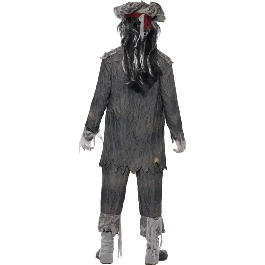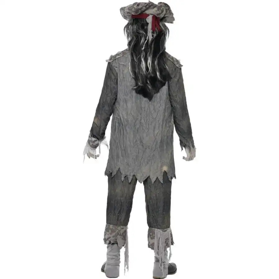 Costume de pirate fantôme, pour homme ou femme, composé d’une veste, d’un pantalon et d’un chapeau, tous trois de couleur grise. Les vêtements sont en forme de guenilles, ce qui accentue parfaitement l’aspect mort-vivant de votre personnage. L’ensemble est disponible en taille M, L ou XL.