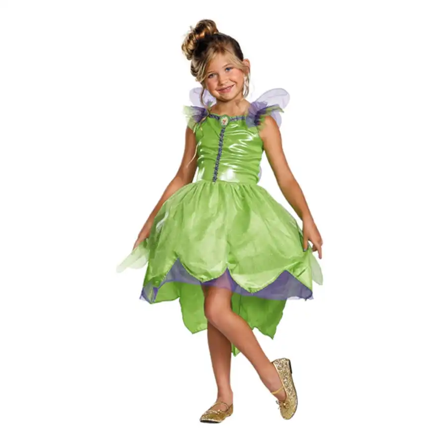 Le costume que nous avons ici est composĂ© d’une jolie robe verte, avec une photo de Clochette imprimĂ©e dans un mĂ©daillon accrochĂ© sur la partie avant du costume (au niveau du col).