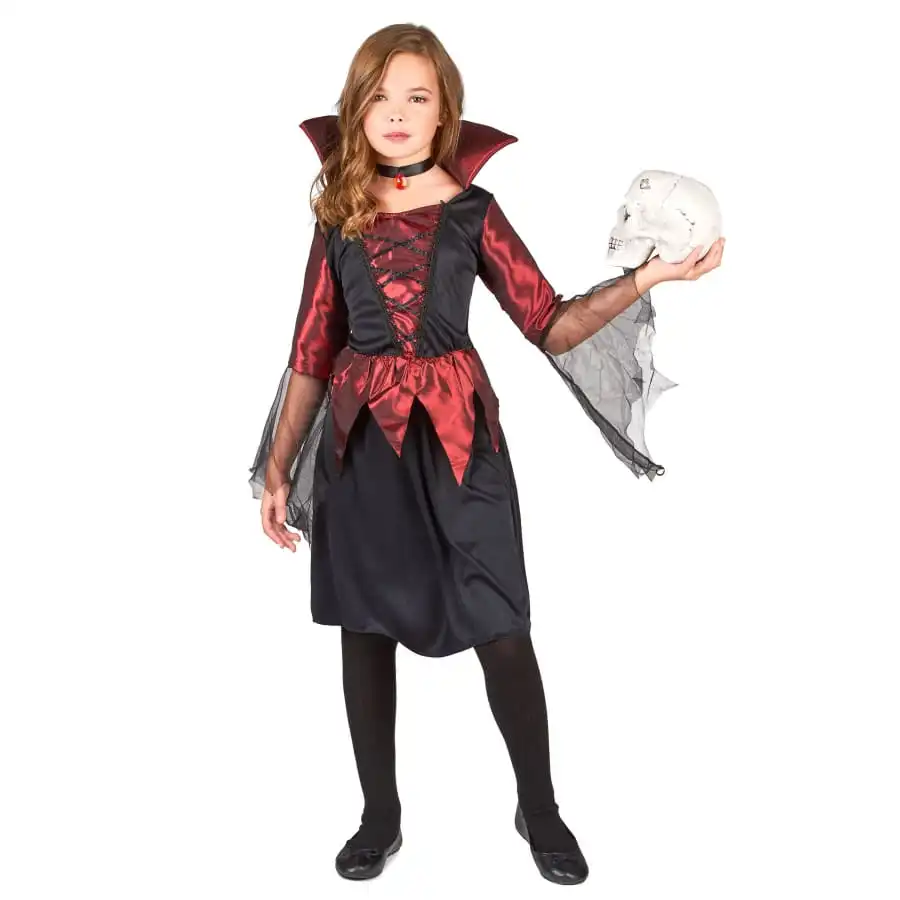 Si votre petite fille compte se transformer en une sorcière à l’occasion de la fête des morts, pourquoi ne pas lui offrir la tenue qu’elle mérite. En effet, nous vous proposons un déguisement fille vampire noir et bordeaux satiné. Il est formé d’une robe mi- longue de couleur noire, avec des détails rouges. La matière utilisée pour celle-ci s’avère assez légère et fluide, garantissant un meilleur confort. Elle est maintenue à la taille par une ceinture bouffante de couleur rouge. Cette dernière est faite de tissu satiné, également repris au niveau des manches et du corsage, ainsi que du col semi-rigide. Un voile très fin orne le bout de chaque manche. Un petit pendentif rouge accroché à un ruban noir complète l’ensemble de cette tenue.