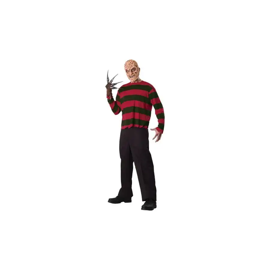 DĂ©guisement de Freddy Kruger sous licence, pour homme, composĂ© d’un affreux masque en mousse rouge et beige, d’un T-shirt Ă rayures rouges et noires et d’un gant avec griffe. Faites revivre Ă vos amis et ennemis leurs pires cauchemars.