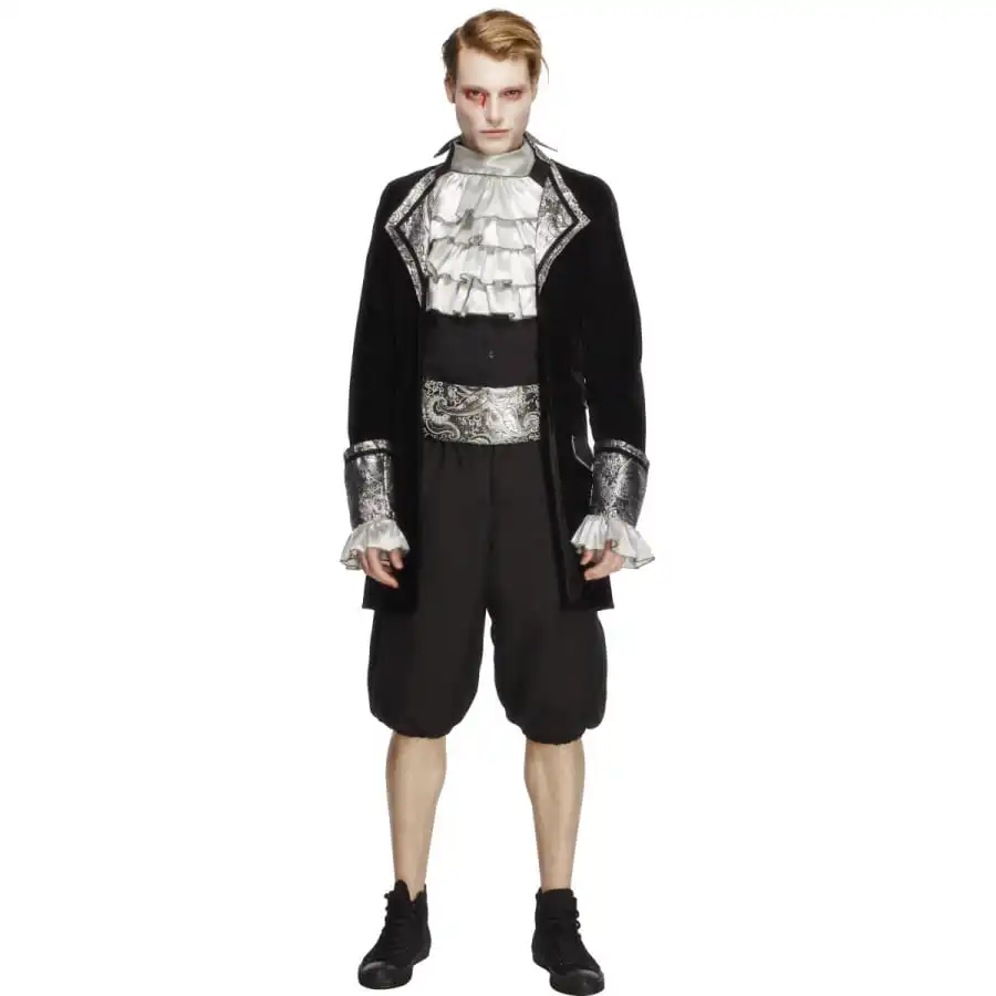DĂ©guisement de comte baroque, pour homme, composĂ© d’une veste, d’un pantalon, d’une cravate et d’une ceinture. Ce superbe ensemble est de couleur noire et argentĂ©e, avec des motifs fins et Ă©lĂ©gants, pour s’accorder Ă votre allure. Il sera idĂ©al pour une fĂŞte historique.