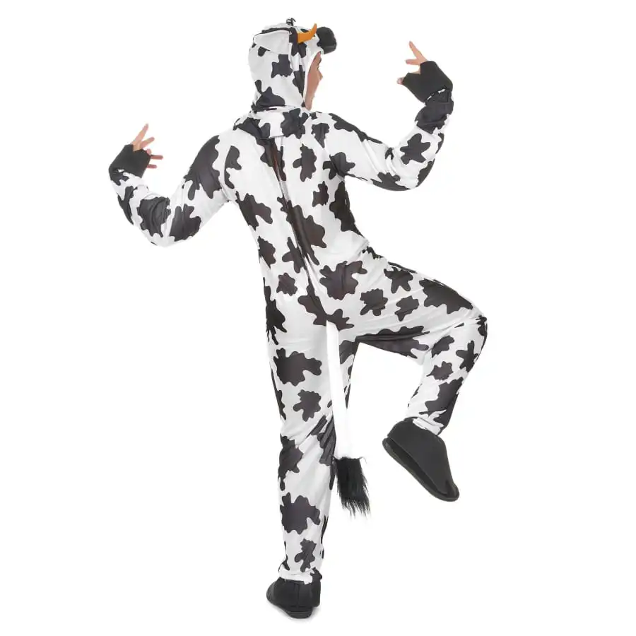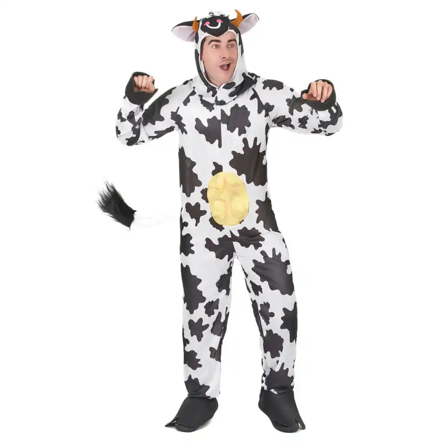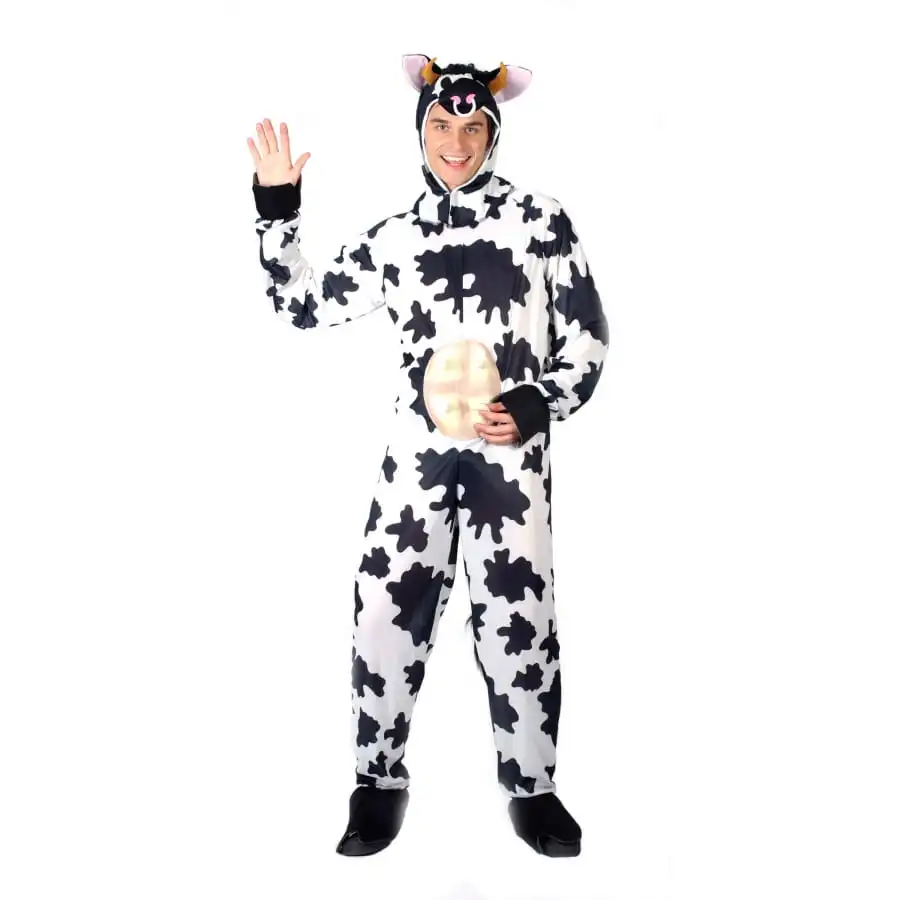 Pour rendre une soirĂ©e plus fun, choisissez de porter ce dĂ©guisement humoristique de vache pour adulte. Ici, on a une combinaison Ă manches longues, blanche tachetĂ©e de noir avec, de larges bords cĂ´tes noirs sur les poignets et les chevilles, donnant l’effet sabot. Elle est munie d’une queue blanche touffue Ă l’arrière et de fausses mamelles en plastique rose sur le ventre. Pour plus de rĂ©alisme, portez la capuche en forme de tĂŞte de vache, avec des yeux, des cornes et des oreilles, qui se referme sur le cou par un velcro, et qui laisse le visage Ă dĂ©couvert. Cet ensemble est fait d’un tissu fluide, lĂ©ger et très agrĂ©able Ă porter.